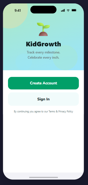 מסך פתיחה נעים עם מיתוג KidGrowth, גרדיאנט רך וכפתורי יצירת חשבון והתחברות.